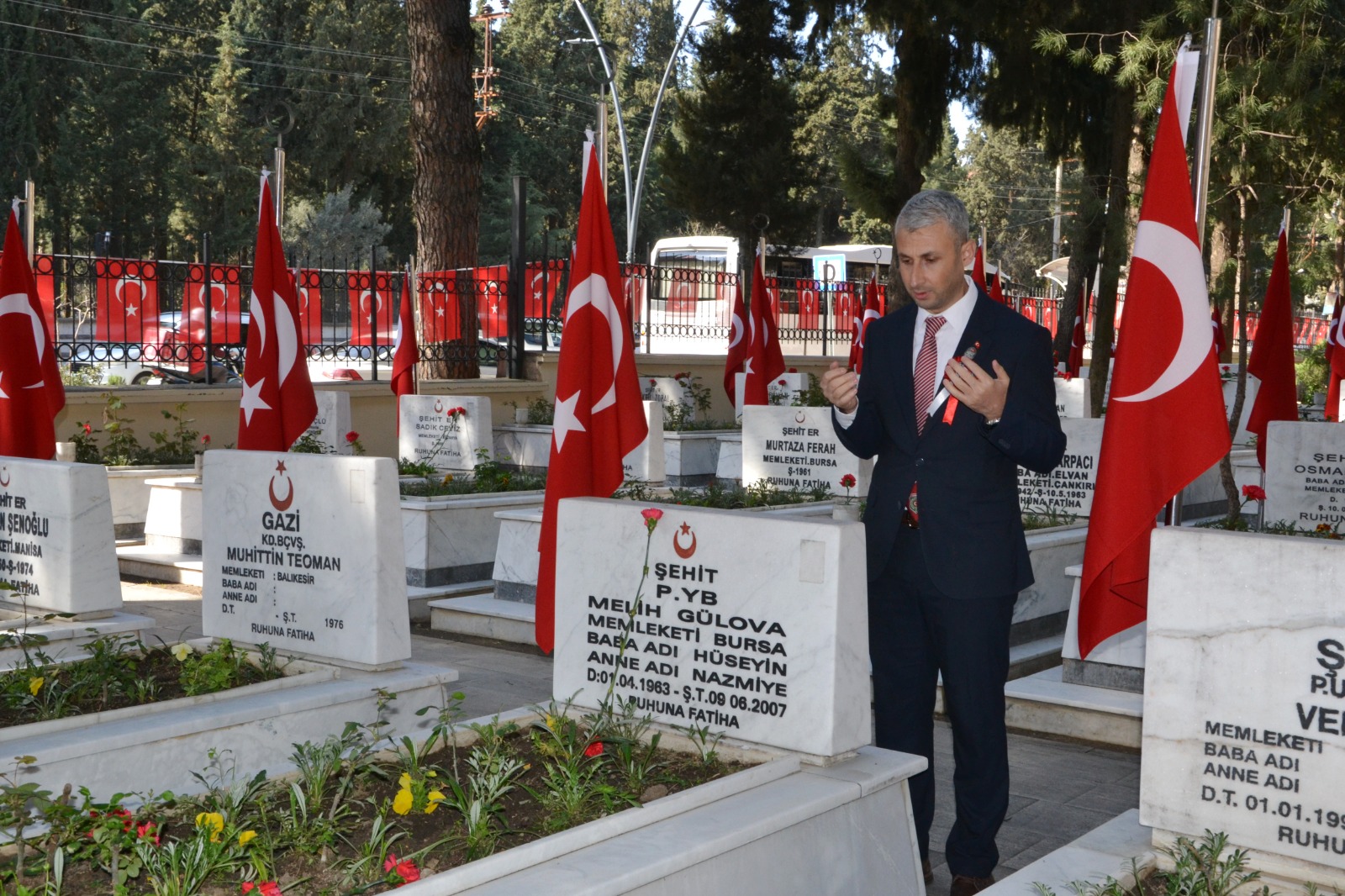 Hatuniye Camii İmlam Hatip Hayrettin Çoban tarafından Kur’an-ı Kerim tilaveti okundu. Manisa İl Müftüsü Şükrü Kabukçu dua etti. Ardından Vali Özkan, Başkan Zeyrek ve protokol üyeleri şehitliğe karanfil bıraktı.